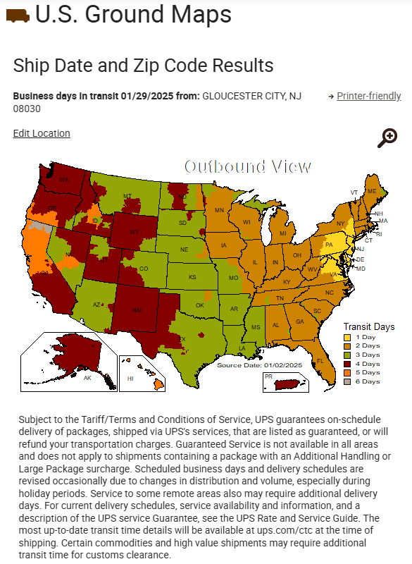 G&M is located in South Jersey. We are just 10 minutes from Philadelphia and only 1 day transit for UPS Ground to as far north as Conneticut, as far south as Virginia and most of Pensylvania. This also means your shirts can arrive the next day via UPS Ground from suppliers like ACC, Alpha, G&M PRINTWEAR 856.742.5551 / fax 856.742.5549 UPS Ground Map (click here for transit time map) |