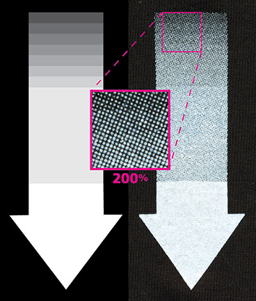 The smooth greys of the left arrow are misleading. At a 60” distance the halfone dots would visually mix to appear more like the left arrow. At a closer look, the right arrow details the half tone dots and their roughness. Download a PDF of What are halftone dots? to forward to your clients. |