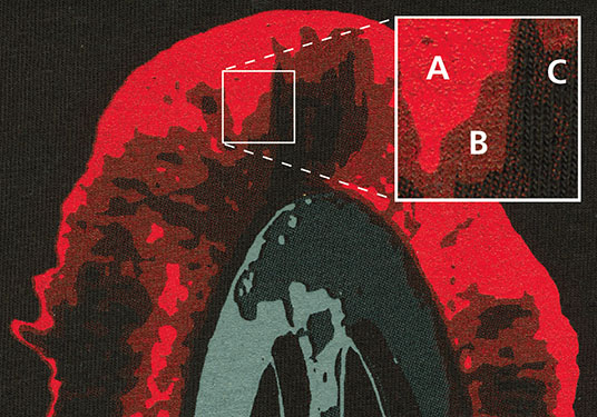 Under basing is achieved when a white ink is used to print a base for a bright color to be visible and true to its desired color on a medium to dark colored garment. Do you have to under base? Yes. Below you will find a photo of red ink on a black t-shirt. There are areas with and with out under base. The brighter areas have a white ink under base. The white ink is printed and then flash cured to create a dry printable surface. The red ink is then printed on top. Almost all inks that are printed on medium to dark colored goods require under basing and flashing. |